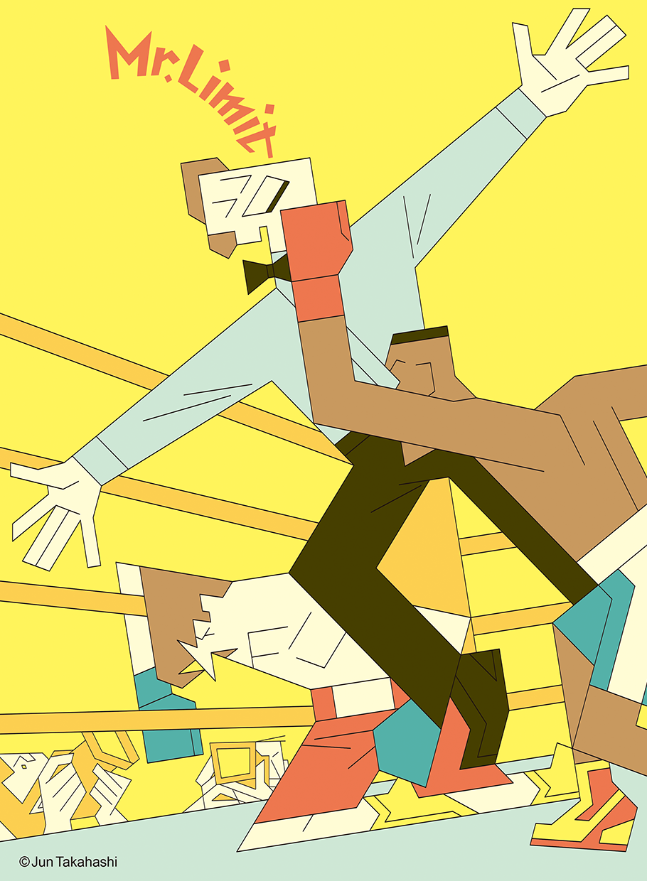 謎のヨコワケ紳士ミスターリミットはいつも何かにやられっぱなしだ。いかなる局面においても、彼がその底抜けな笑顔を絶やさないのは、一体なぜだろうか。疲弊を超えたナチュラルハイ?人類の幸せを願うラストメッセージ?社会的な拘束からの解放感?本当のところは誰にもわからない。ーAll I can do is laugh(もう笑うしかない)ーあまりの理不尽さにどう反応していいのかわからないときの自己防衛反応。これがわたしの暫定的な結論である。さりとて、この世界に絶対的な正解など存在しないのだ。あとは受け手の解釈に委ねようではないか。